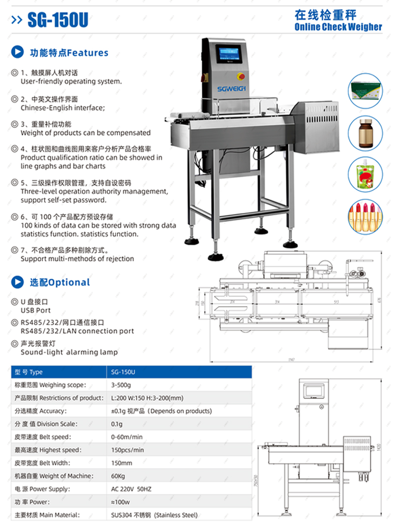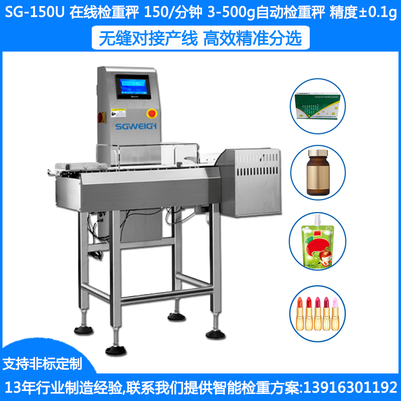 你們?nèi)绾蜗蛭彝扑]合適的自動稱重機:為了給貴司推薦合適的機型,需要確認(rèn)以下產(chǎn)品要素信息: 1.產(chǎn)品類型,如袋裝,瓶裝,盒裝等 2.產(chǎn)品外形尺寸(長寬高),若有多種規(guī)格請列全或提供最大和最小尺寸。 3.產(chǎn)品重量,若有多種規(guī)格請列全或提供最大和最小重量。 4.速度要求,是否是勻速通過。 5.精度要求(上下偏差多少克為不合格)或檢測多一件少一件。